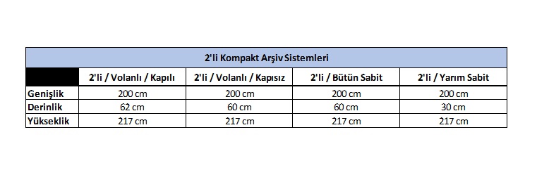 2’li Kompakt Arşiv Sistemi Ürünlerimizde, Uygun Ödeme Avantajları, isteğe özel Model ve Renk Çeşitliliği ile üretim yapılmaktadır.