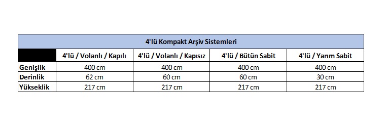 4’lü Kompakt Arşiv Sistemi Ürünlerimizde, Uygun Ödeme Avantajları, isteğe özel Model ve Renk Çeşitliliği ile üretim yapılmaktadır.